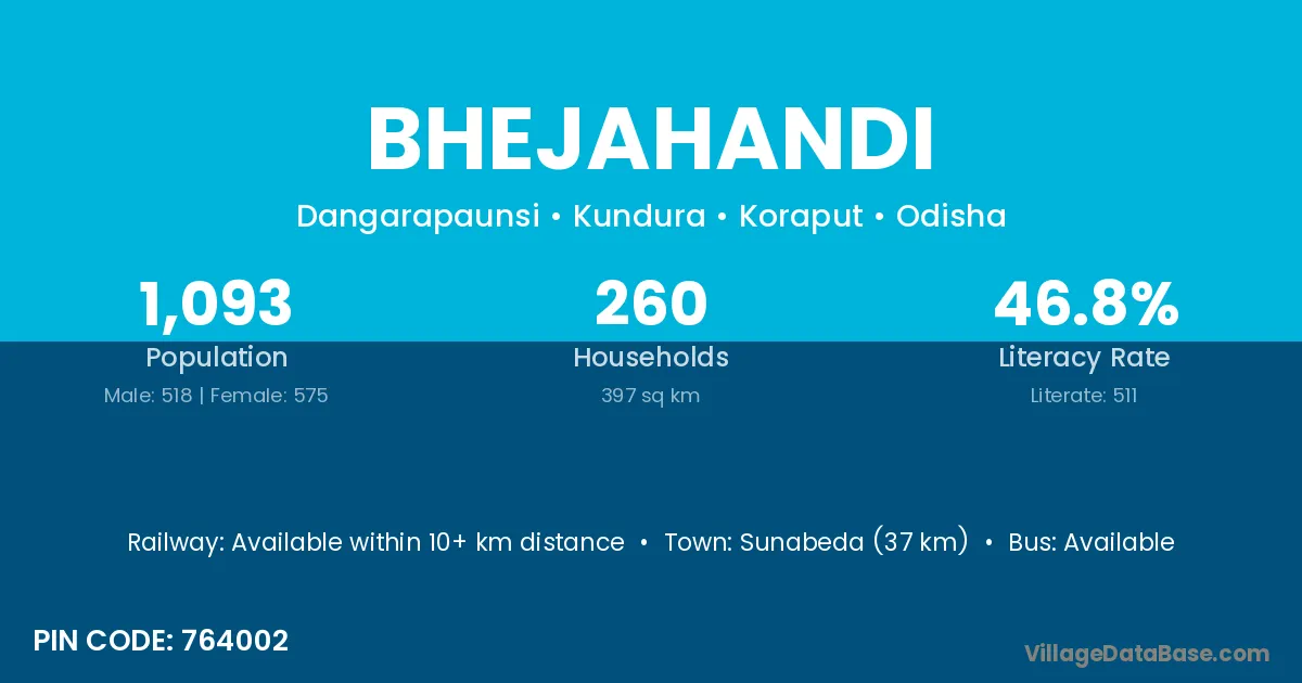 Sunabeda (37 km) is the nearest town to Bhejahandi village for major economic activities and is located approximately 37 km away.