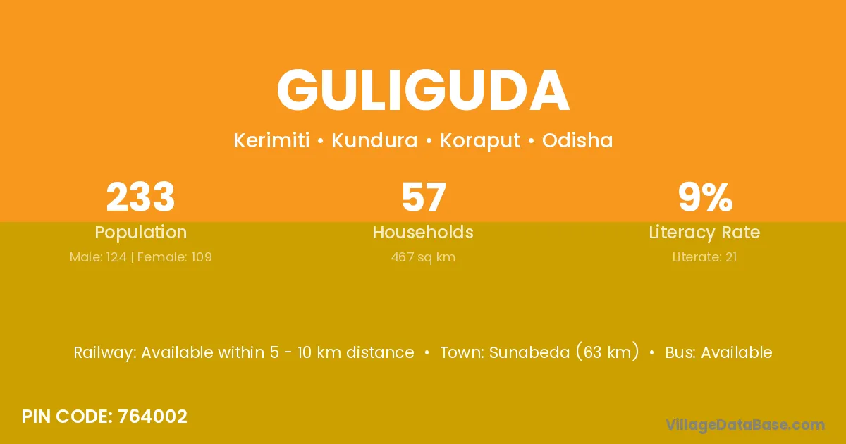 Sunabeda (63 km) is the nearest town to Guliguda village for major economic activities and is located approximately 63 km away.