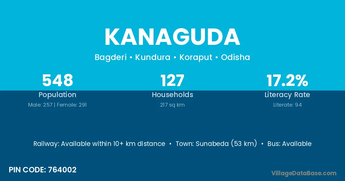 Sunabeda (53 km) is the nearest town to Kanaguda village for major economic activities and is located approximately 53 km away.