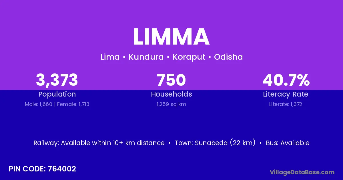 Sunabeda (22 km) is the nearest town to Limma village for major economic activities and is located approximately 22 km away.