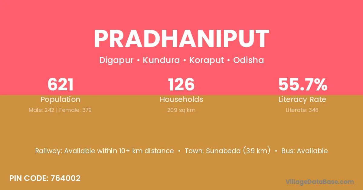 Sunabeda (39 km) is the nearest town to Pradhaniput village for major economic activities and is located approximately 39 km away.