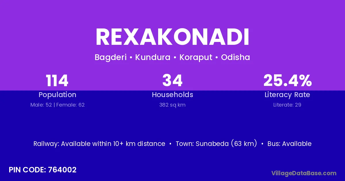 Sunabeda (63 km) is the nearest town to Rexakonadi village for major economic activities and is located approximately 63 km away.