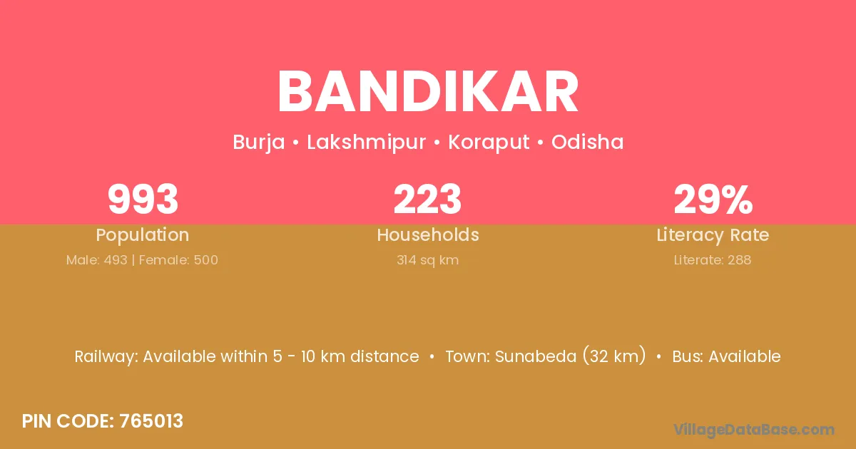 Sunabeda (32 km) is the nearest town to Bandikar village for major economic activities and is located approximately 32 km away.