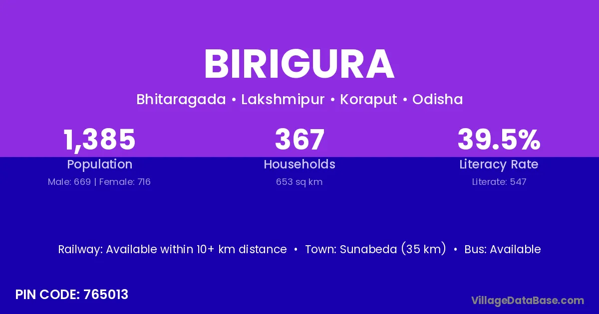Sunabeda (35 km) is the nearest town to Birigura village for major economic activities and is located approximately 35 km away.