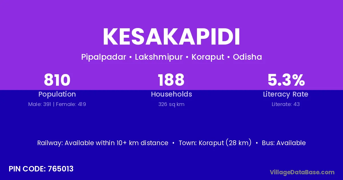 Koraput (28 km) is the nearest town to Kesakapidi village for major economic activities and is located approximately 28 km away.