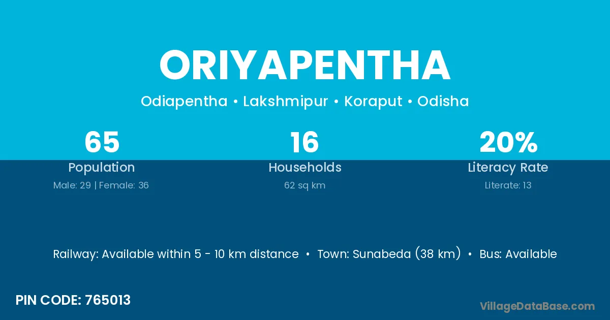Sunabeda (38 km) is the nearest town to Oriyapentha village for major economic activities and is located approximately 38 km away.