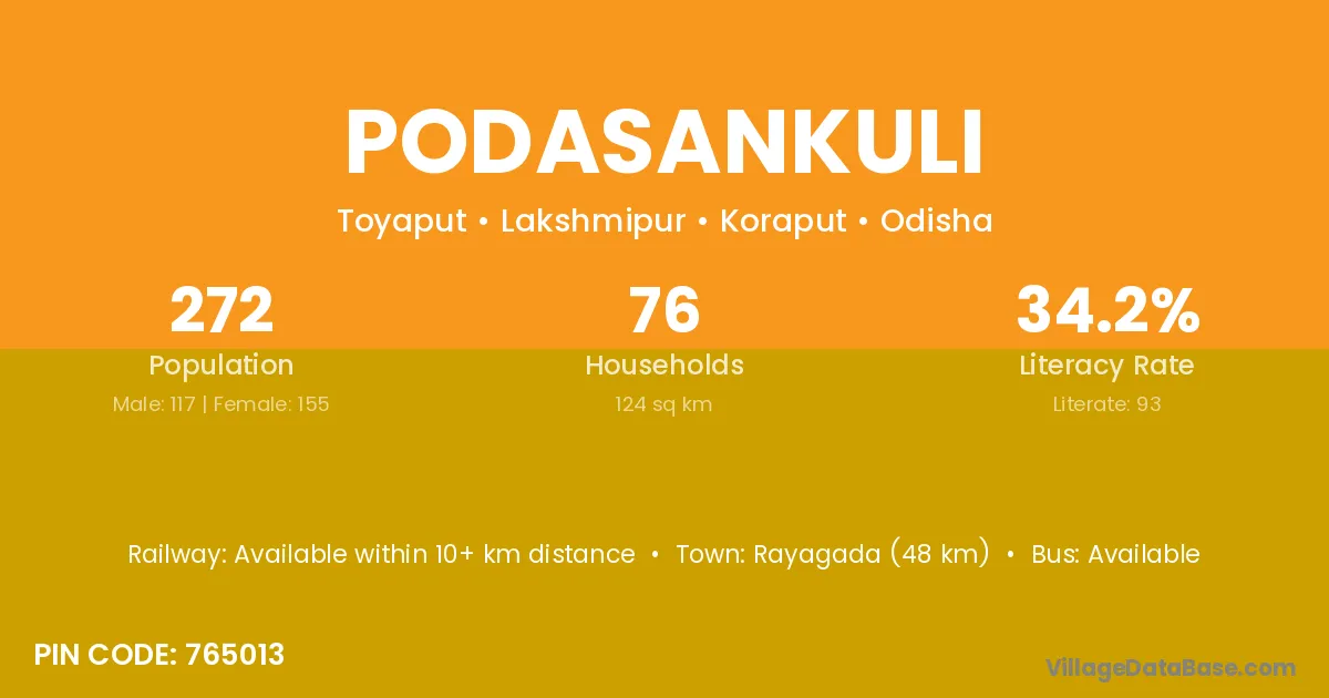 Rayagada (48 km) is the nearest town to Podasankuli village for major economic activities and is located approximately 48 km away.