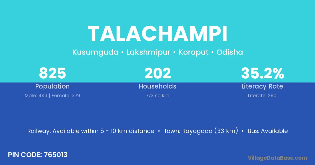 Rayagada (33 km) is the nearest town to Talachampi village for major economic activities and is located approximately 33 km away.
