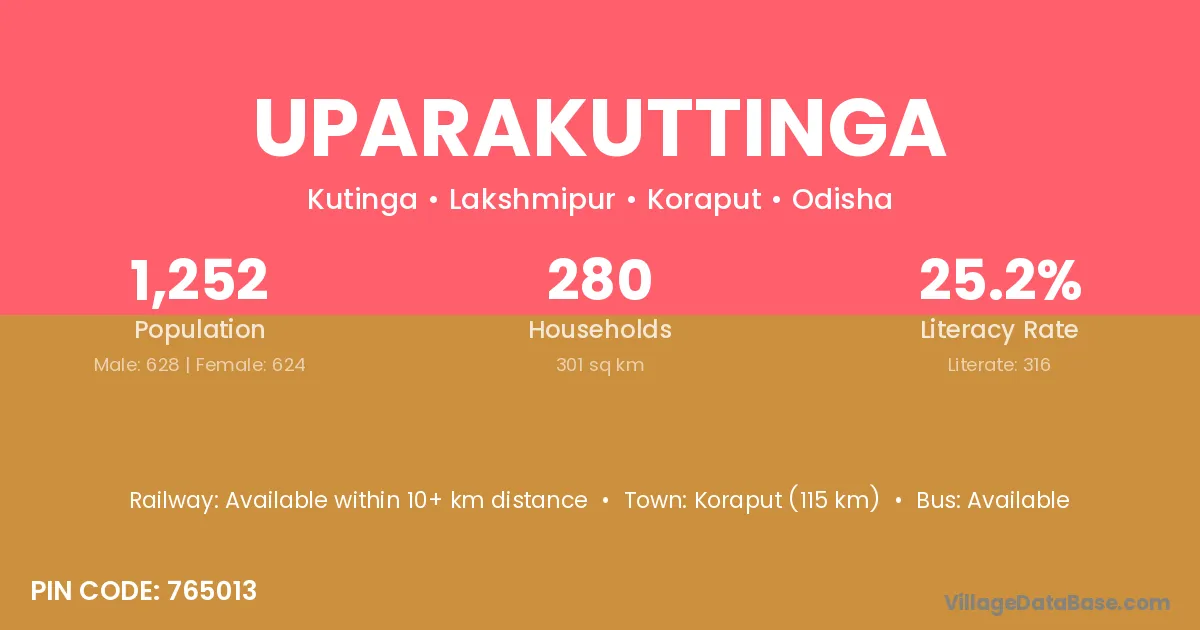 Koraput (115 km) is the nearest town to Uparakuttinga village for major economic activities and is located approximately 115 km away.