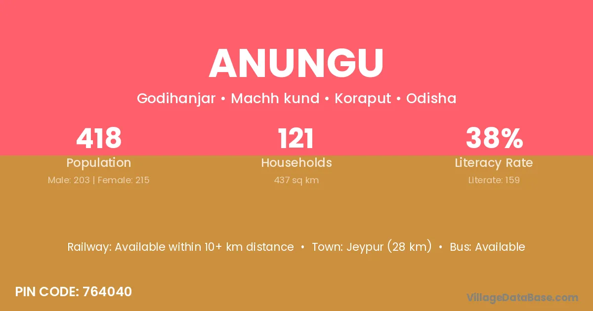 Jeypur (28 km) is the nearest town to Anungu village for major economic activities and is located approximately 28 km away.
