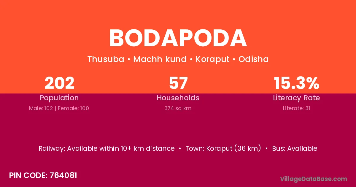 Koraput (36 km) is the nearest town to Bodapoda village for major economic activities and is located approximately 36 km away.