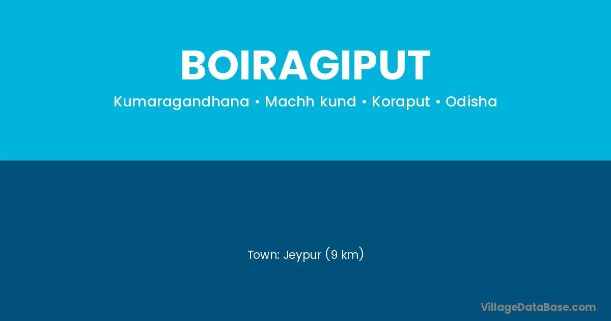 Jeypur (9 km) is the nearest town to Boiragiput village for major economic activities and is located approximately 9 km away.
