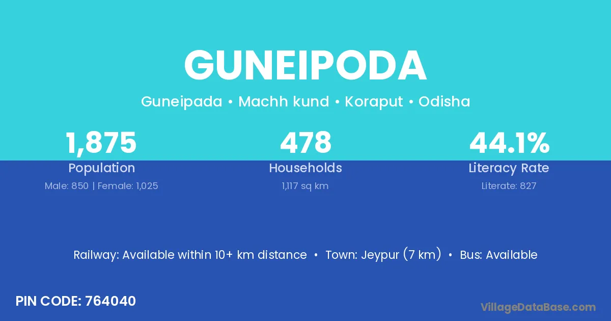 Jeypur (7 km) is the nearest town to Guneipoda village for major economic activities and is located approximately 7 km away.