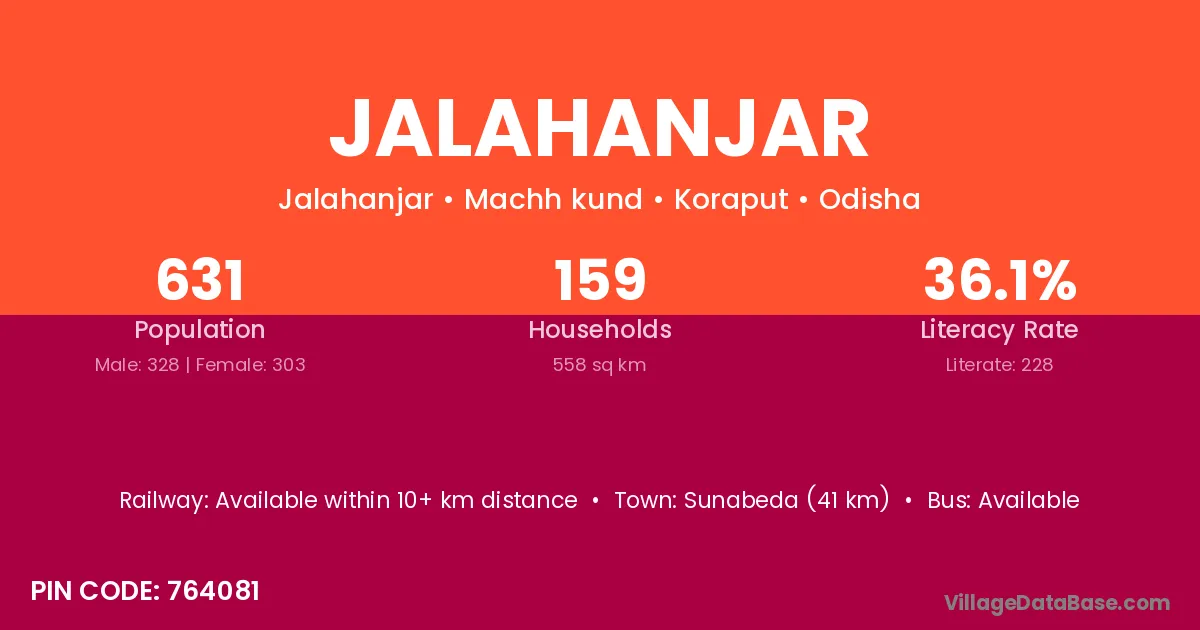 Sunabeda (41 km) is the nearest town to Jalahanjar village for major economic activities and is located approximately 41 km away.