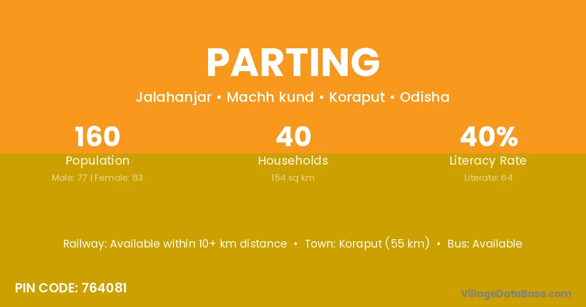 Koraput (55 km) is the nearest town to Parting village for major economic activities and is located approximately 55 km away.