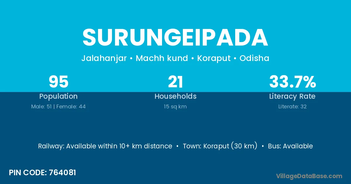 Koraput (30 km) is the nearest town to Surungeipada village for major economic activities and is located approximately 30 km away.