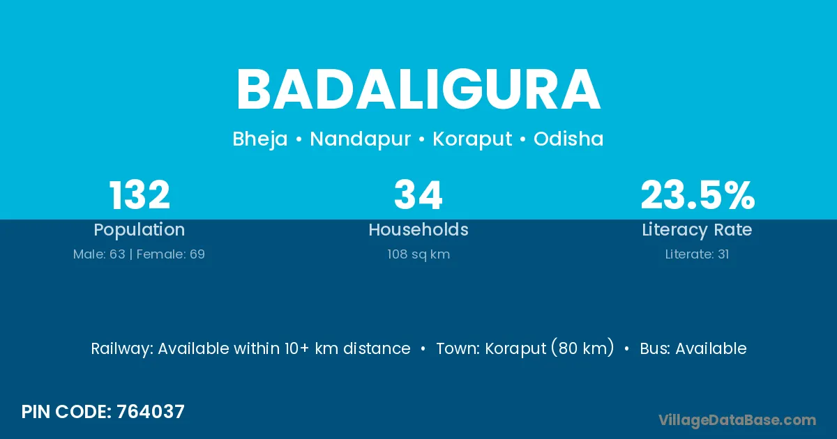Koraput (80 km) is the nearest town to Badaligura village for major economic activities and is located approximately 80 km away.