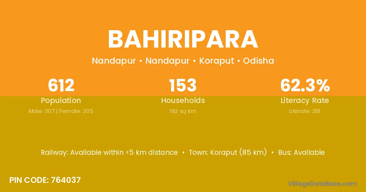 Koraput (85 km) is the nearest town to Bahiripara village for major economic activities and is located approximately 85 km away.