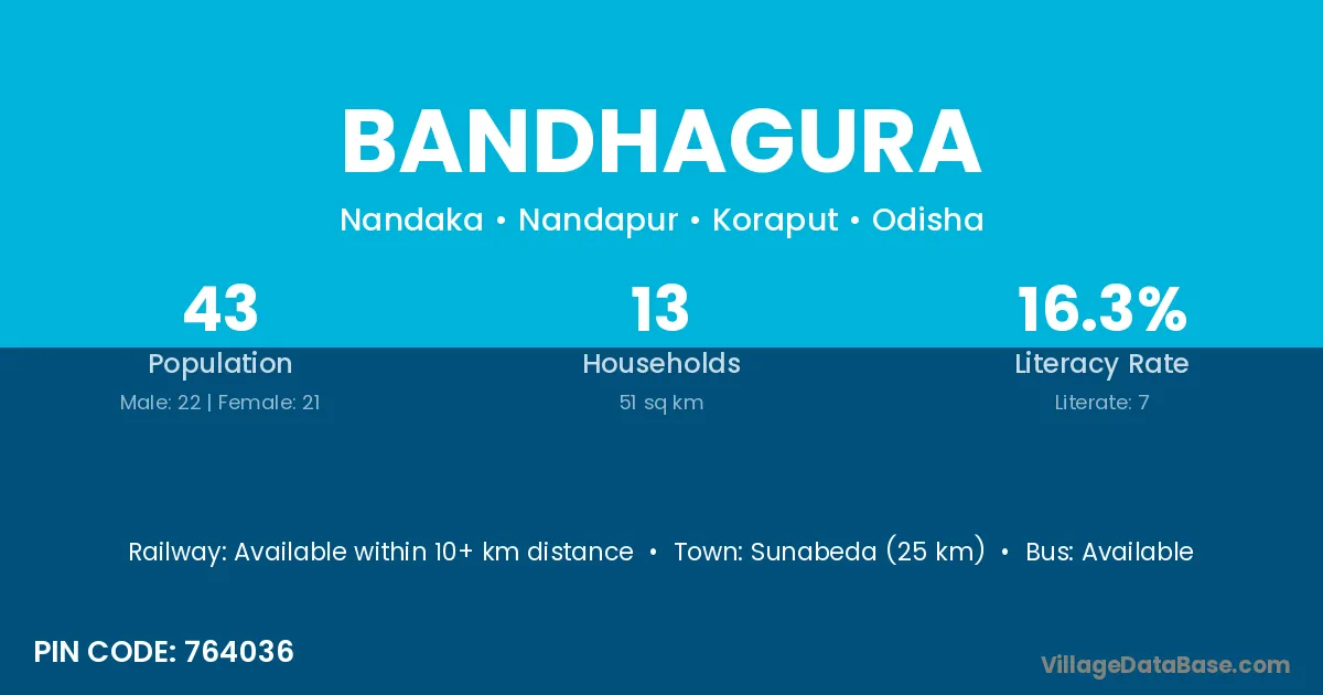 Sunabeda (25 km) is the nearest town to Bandhagura village for major economic activities and is located approximately 25 km away.