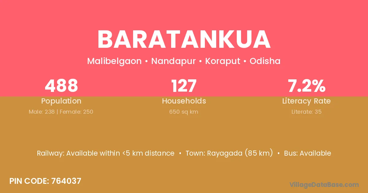 Rayagada (85 km) is the nearest town to Baratankua village for major economic activities and is located approximately 85 km away.