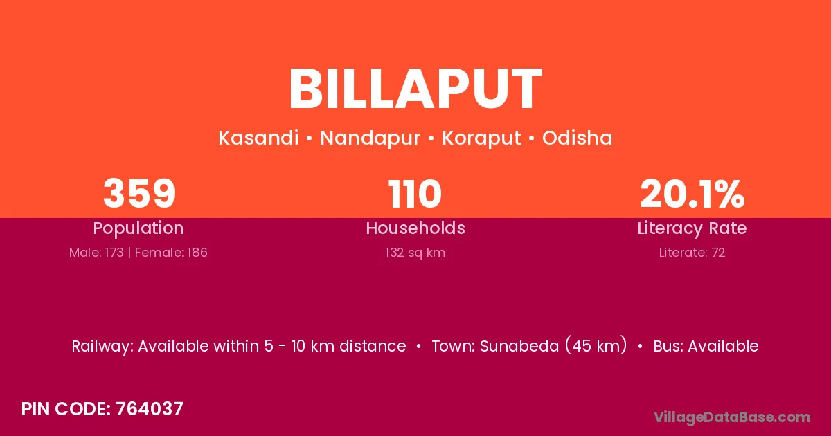 Sunabeda (45 km) is the nearest town to Billaput village for major economic activities and is located approximately 45 km away.