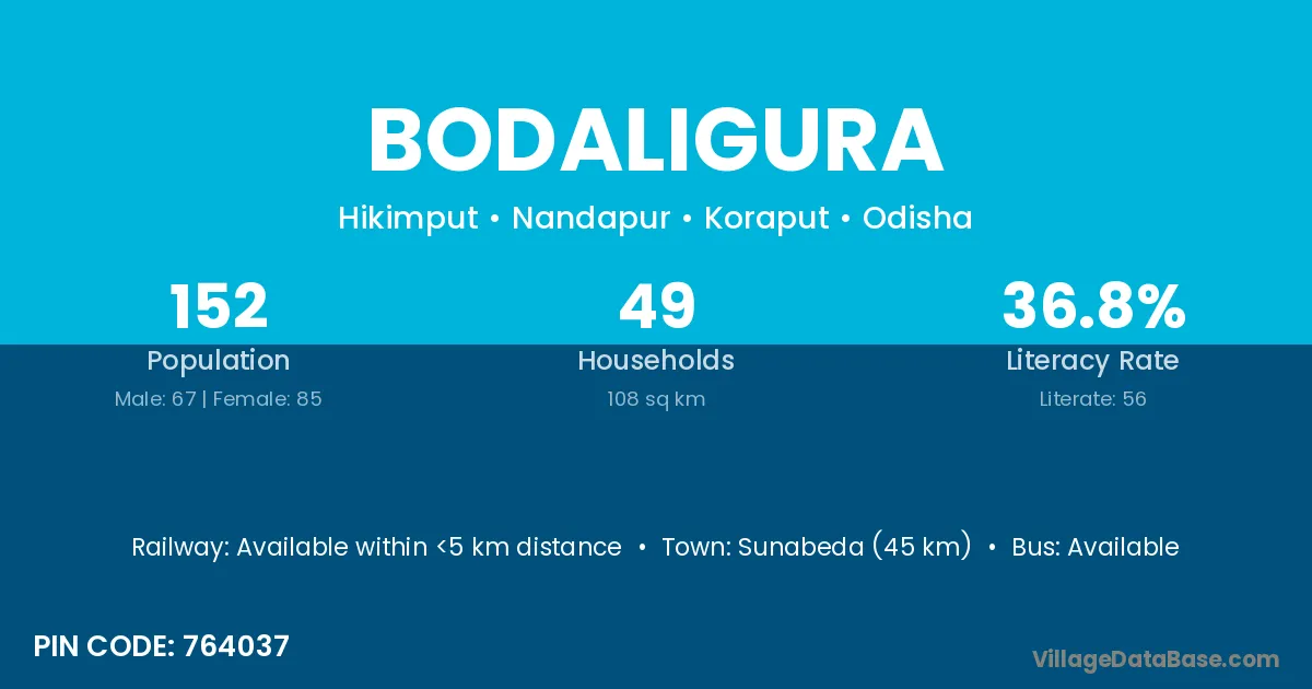 Sunabeda (45 km) is the nearest town to Bodaligura village for major economic activities and is located approximately 45 km away.