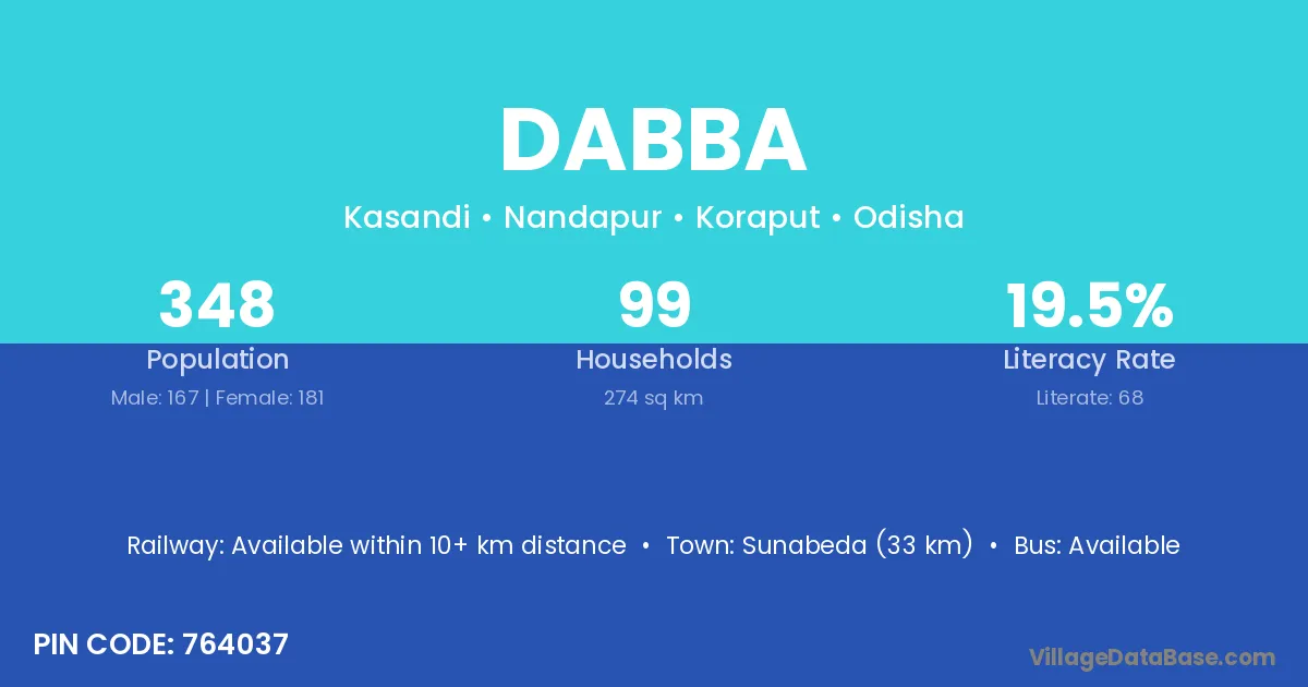 Sunabeda (33 km) is the nearest town to Dabba village for major economic activities and is located approximately 33 km away.
