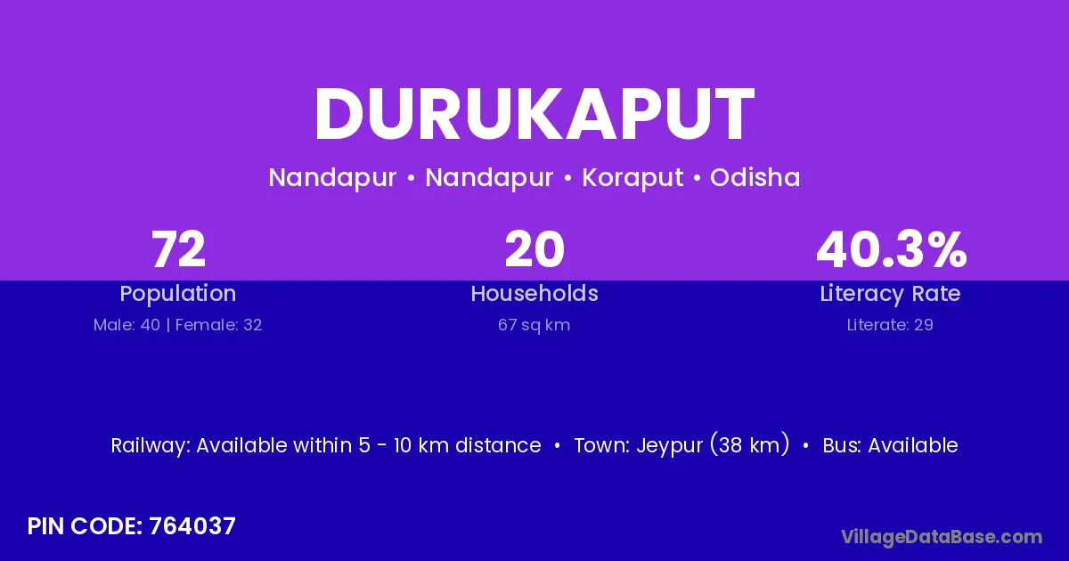 Jeypur (38 km) is the nearest town to Durukaput village for major economic activities and is located approximately 38 km away.