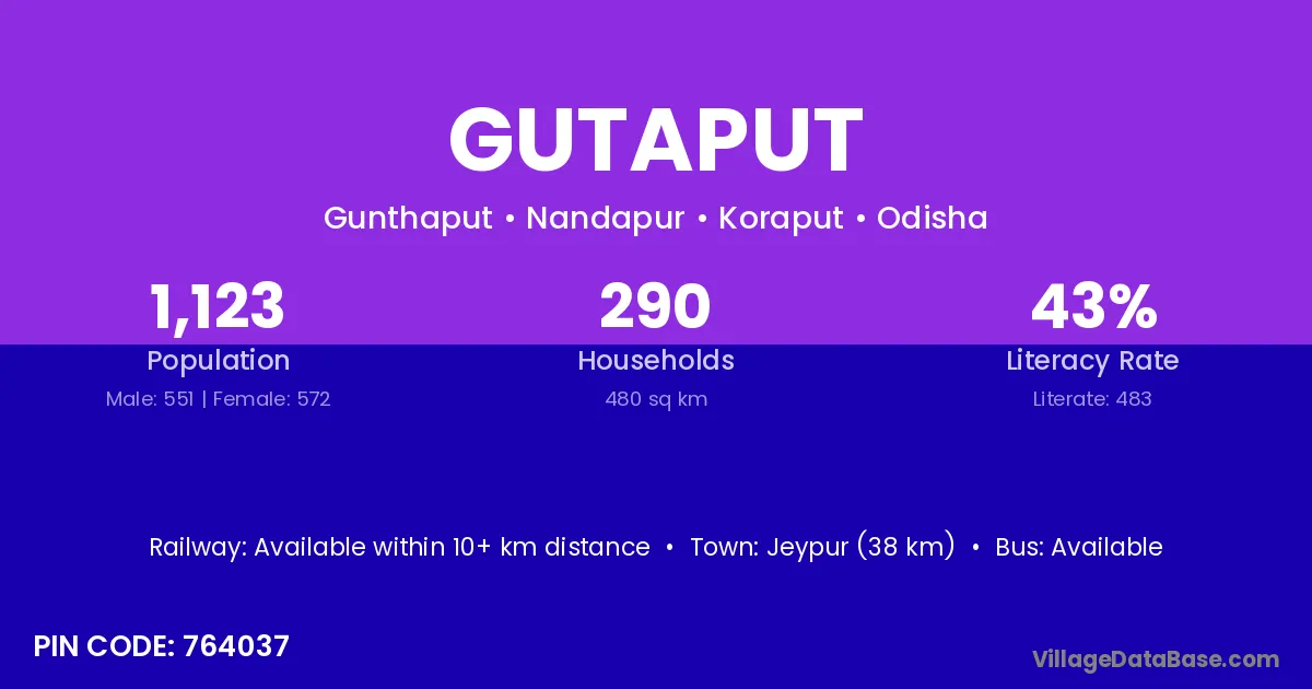 Jeypur (38 km) is the nearest town to Gutaput village for major economic activities and is located approximately 38 km away.