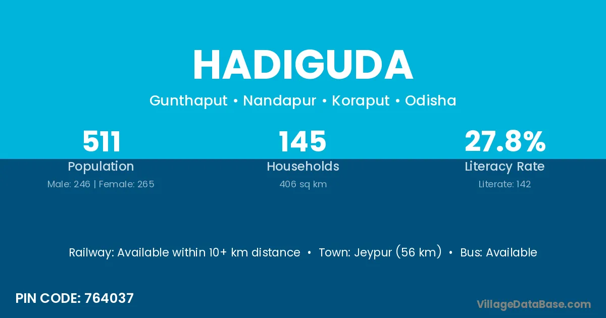 Hadiguda village has a total population of 511 people, of which 246 are males and 265 are females.