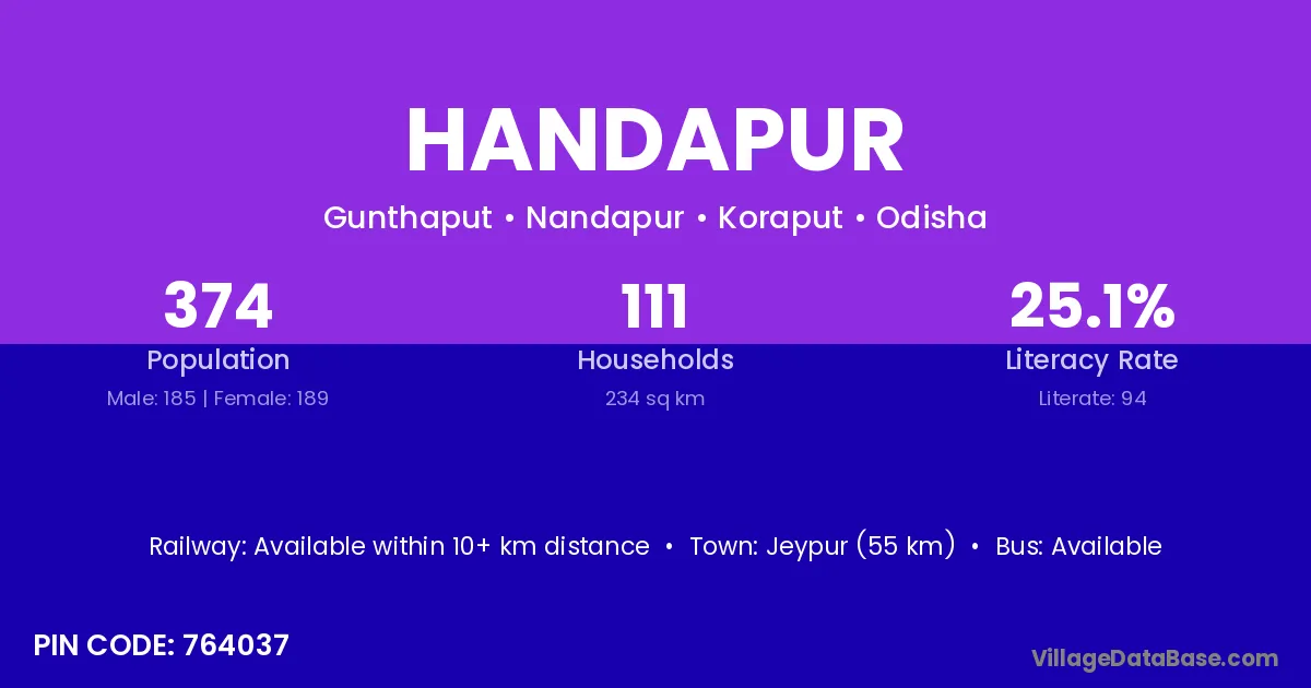 Jeypur (55 km) is the nearest town to Handapur village for major economic activities and is located approximately 55 km away.