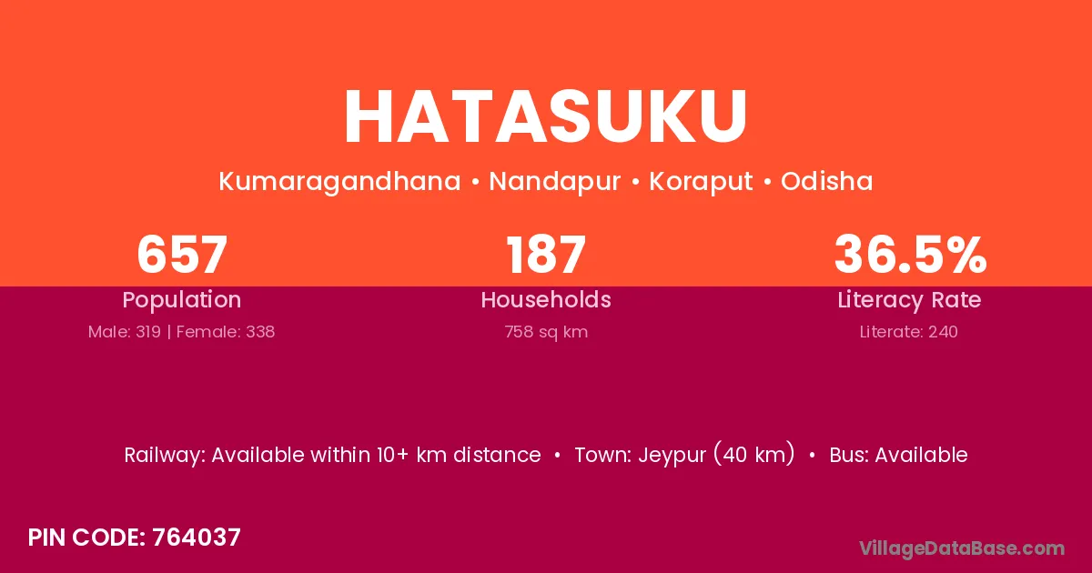 Jeypur (40 km) is the nearest town to Hatasuku village for major economic activities and is located approximately 40 km away.