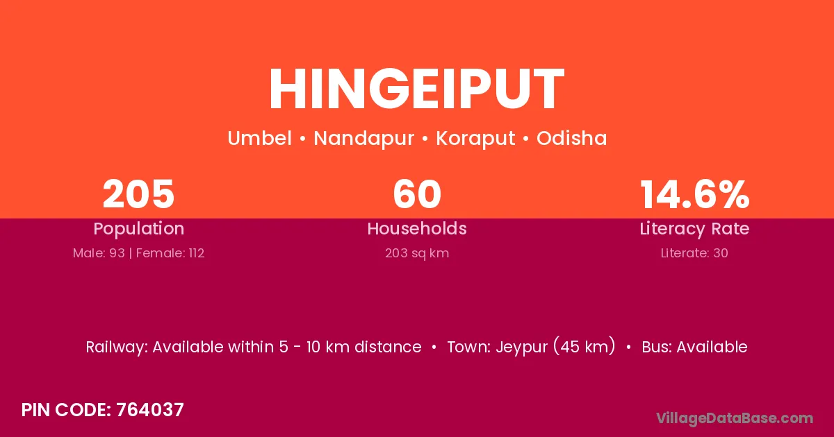 Jeypur (45 km) is the nearest town to Hingeiput village for major economic activities and is located approximately 45 km away.