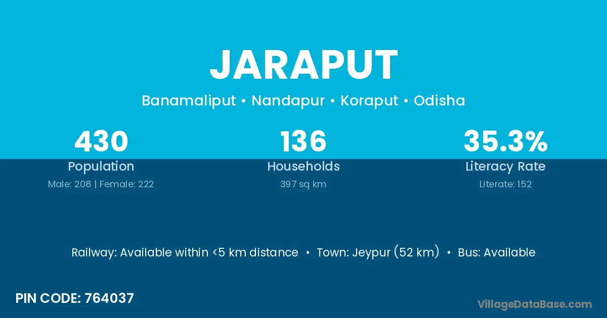 Jeypur (52 km) is the nearest town to Jaraput village for major economic activities and is located approximately 52 km away.