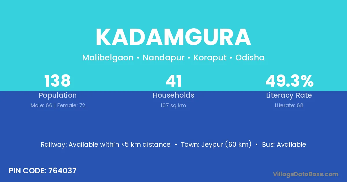Jeypur (60 km) is the nearest town to Kadamgura village for major economic activities and is located approximately 60 km away.