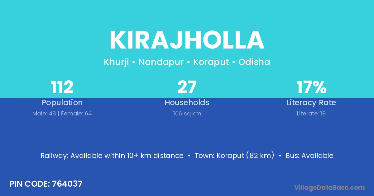 Kirajholla village has a total population of 112 people, of which 48 are males and 64 are females.