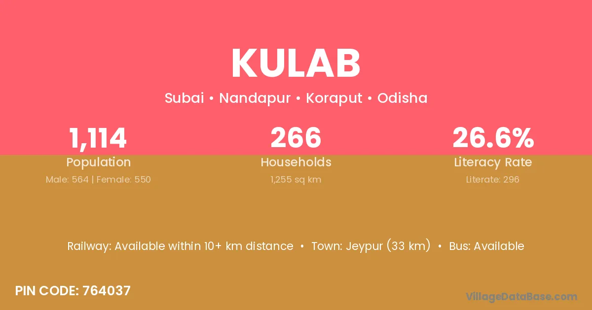 Jeypur (33 km) is the nearest town to Kulab village for major economic activities and is located approximately 33 km away.