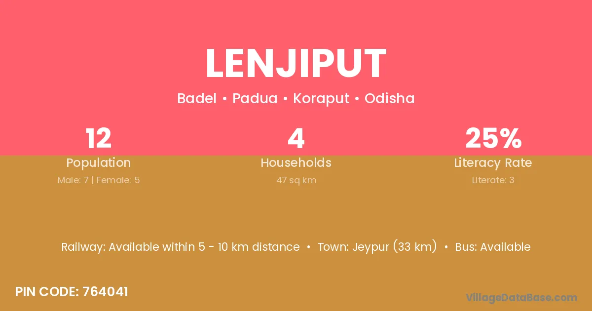 Koraput (64 km) is the nearest town to Lenjiput village for major economic activities and is located approximately 64 km away.