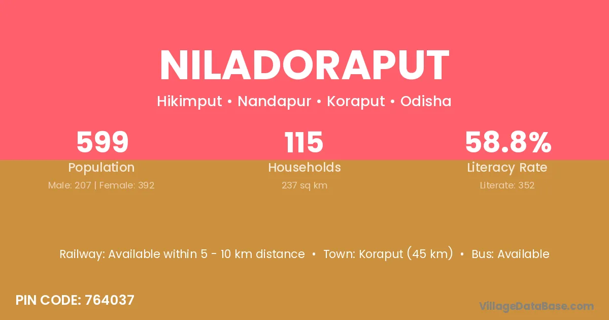 Koraput (45 km) is the nearest town to Niladoraput village for major economic activities and is located approximately 45 km away.