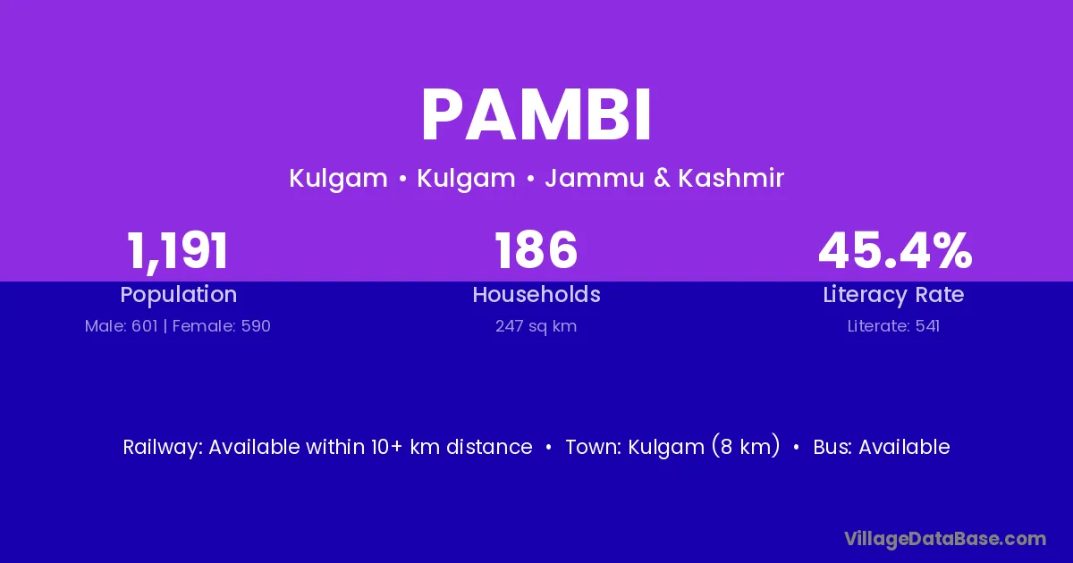The literacy rate of Pambi village is 40.51%. Male literacy stands at 50.42% and female literacy at 32.90%.