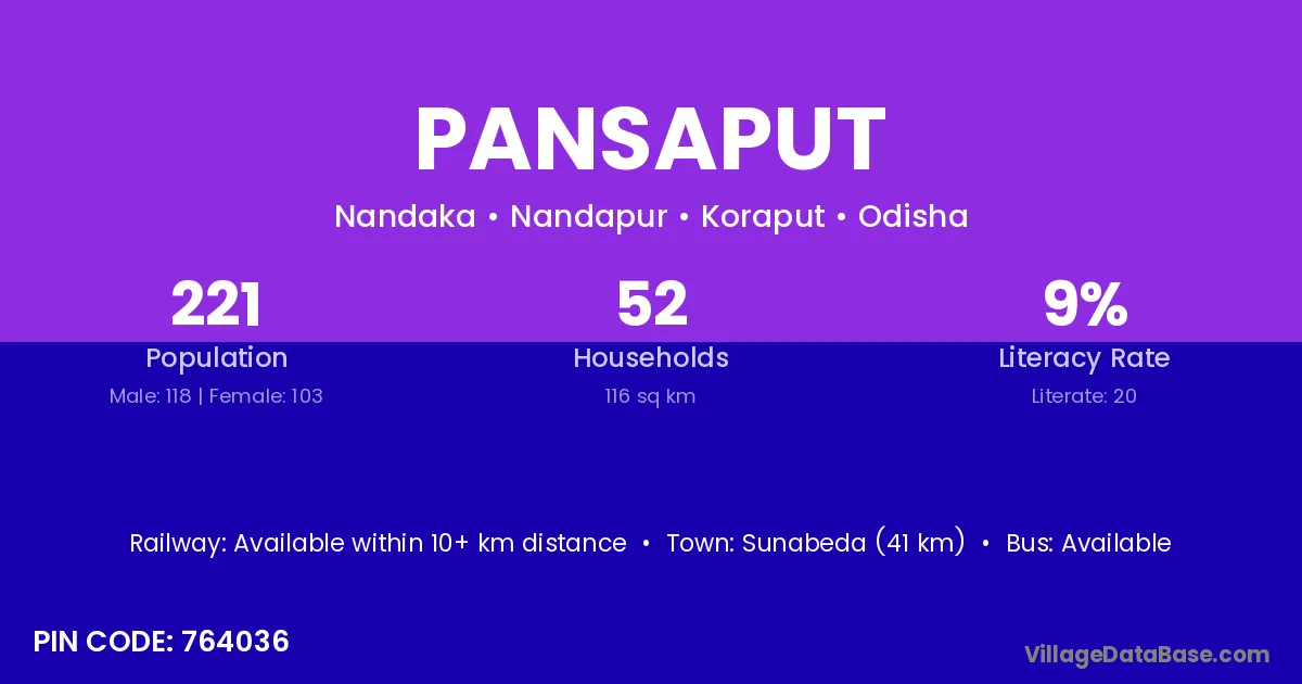 Sunabeda (41 km) is the nearest town to Pansaput village for major economic activities and is located approximately 41 km away.