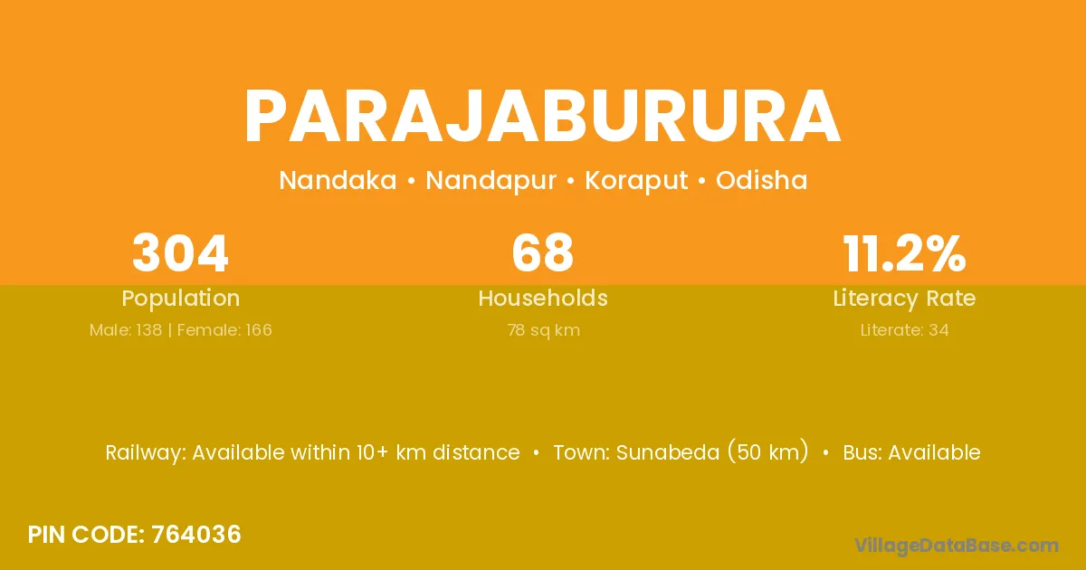 Sunabeda (50 km) is the nearest town to Parajaburura village for major economic activities and is located approximately 50 km away.