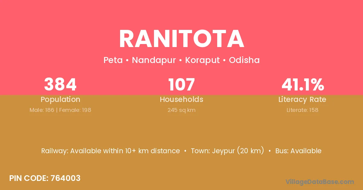 Jeypur (20 km) is the nearest town to Ranitota village for major economic activities and is located approximately 20 km away.