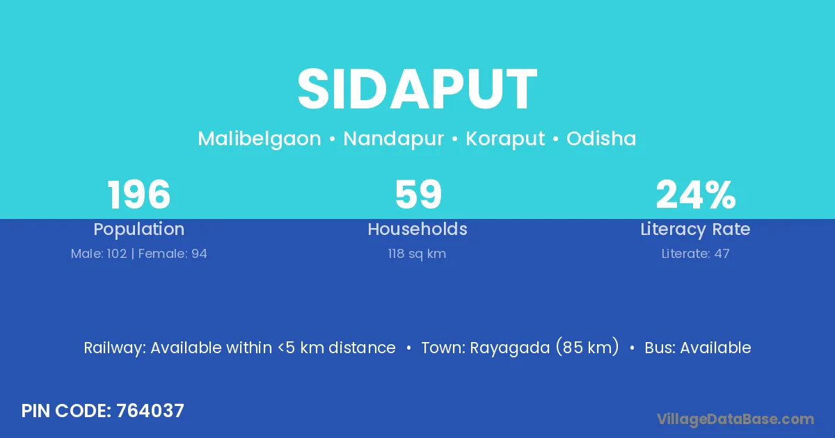 Rayagada (85 km) is the nearest town to Sidaput village for major economic activities and is located approximately 85 km away.