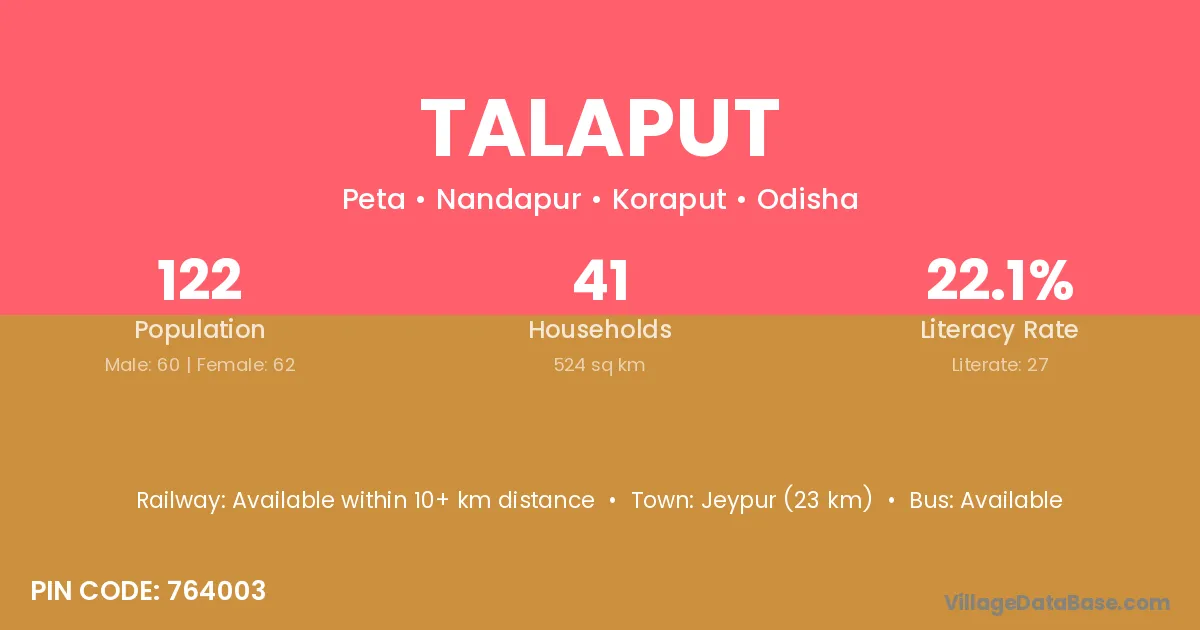 Jeypur (23 km) is the nearest town to Talaput village for major economic activities and is located approximately 23 km away.