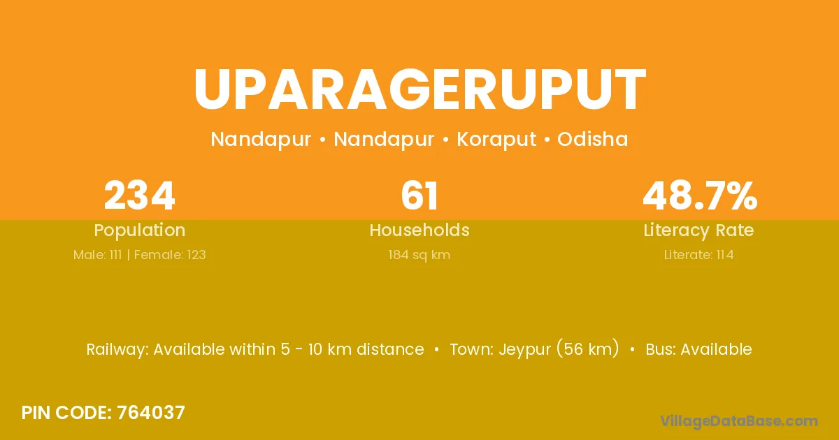 Jeypur (56 km) is the nearest town to Uparageruput village for major economic activities and is located approximately 56 km away.