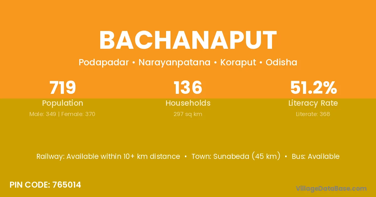 Sunabeda (45 km) is the nearest town to Bachanaput village for major economic activities and is located approximately 45 km away.