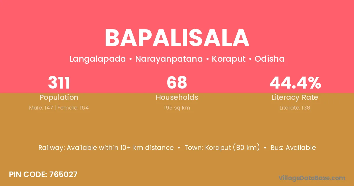 Koraput (80 km) is the nearest town to Bapalisala village for major economic activities and is located approximately 80 km away.