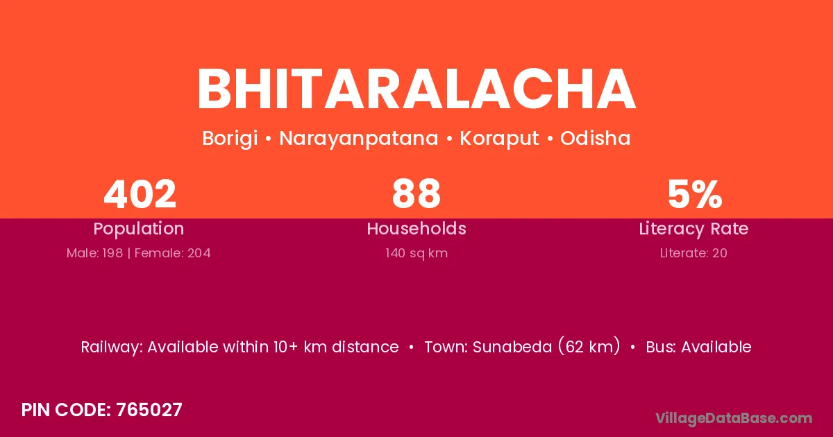 Sunabeda (62 km) is the nearest town to Bhitaralacha village for major economic activities and is located approximately 62 km away.