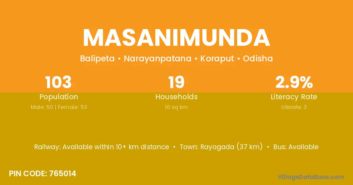 Rayagada (37 km) is the nearest town to Masanimunda village for major economic activities and is located approximately 37 km away.